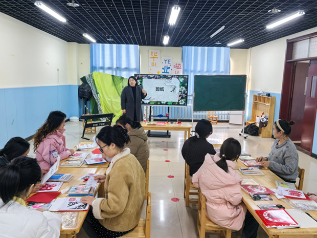 在关键的“教学技能培训”环节,周口文理职业学院的教师们充分发挥高校的专业优势。张胜男老师带来了独具特色的剪纸教学课程,她通过生动的讲解和娴熟的示范,将传统剪纸艺术的魅力与幼儿教育的趣味性相结合,引导幼儿园教师们掌握如何利用剪纸活动锻炼幼儿的动手能力与创造思维。马梦娟老师的弹唱课则聚焦幼儿音乐教育的实践需求,从乐理基础、弹奏技巧到儿童歌曲的即兴伴奏,进行了系统而实用的讲解与训练,有效提升了参训教师的艺术素养和课堂组织能力。这些培训内容直接对应文件中所强调的“活动组织的观摩研讨”、“师幼互动”、“观察记录”等具体帮扶要求,是“高校-幼儿园联合教研组”理念的一次生动实践。