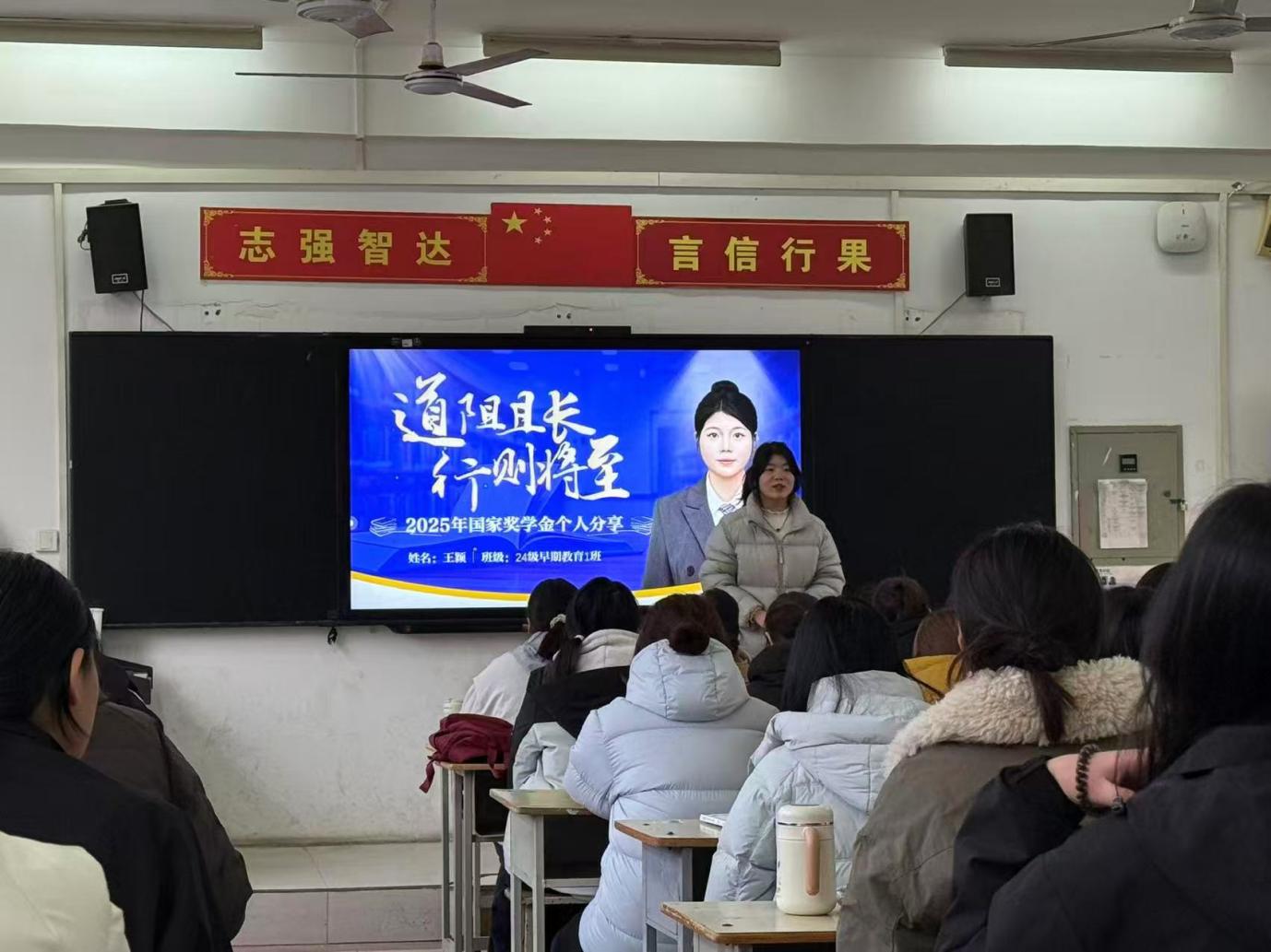 国家奖学金获得者王颖(24 级早期教育一班):以 “专业深耕,实践赋能” 为核心,分享早期教育专业学习心得。她结合幼儿行为观察、亲子活动设计等专业课程,拆解 “理论学习 — 模拟实践 — 反思优化” 的学习闭环,强调利用幼儿园见习机会积累实操经验,通过建立 “课程知识点 + 实践案例” 对照笔记提升专业应用能力,为同专业学生提供了针对性学习路径。